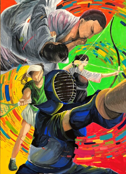 山尾さんの作品は、背景に大きく色彩鮮やかな渦を描き、その上に運動している高校生を描くことで、躍動感のある画面を作り出しています。
